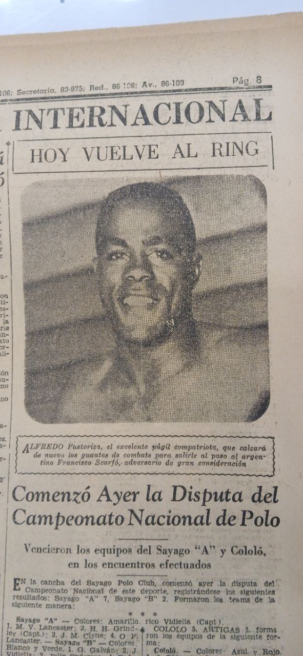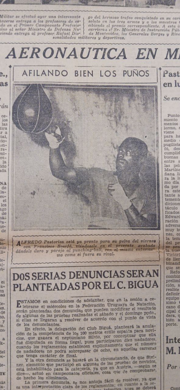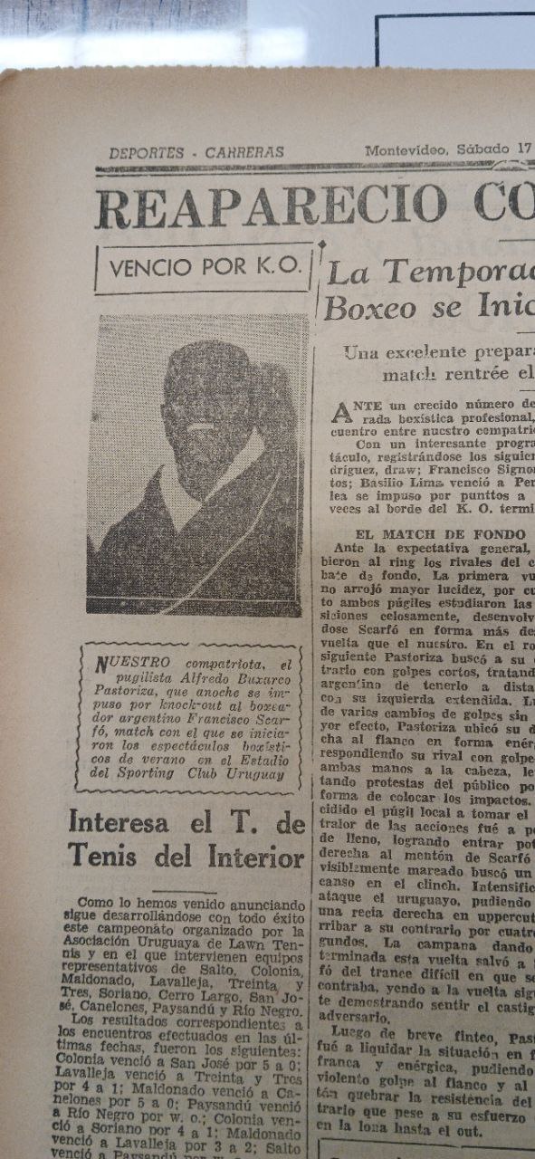 En: “Reapareció con éxito Pastoriza: venció por K.O. a Scarfo”, El Pueblo, año VII, N° 2826, Montevideo, sábado 17 de febrero de 1940, p. 8. [Directores: Raúl Jude y Juan Antonio Buero]. Disponible en Hemeroteca de Palacio Legislativo.