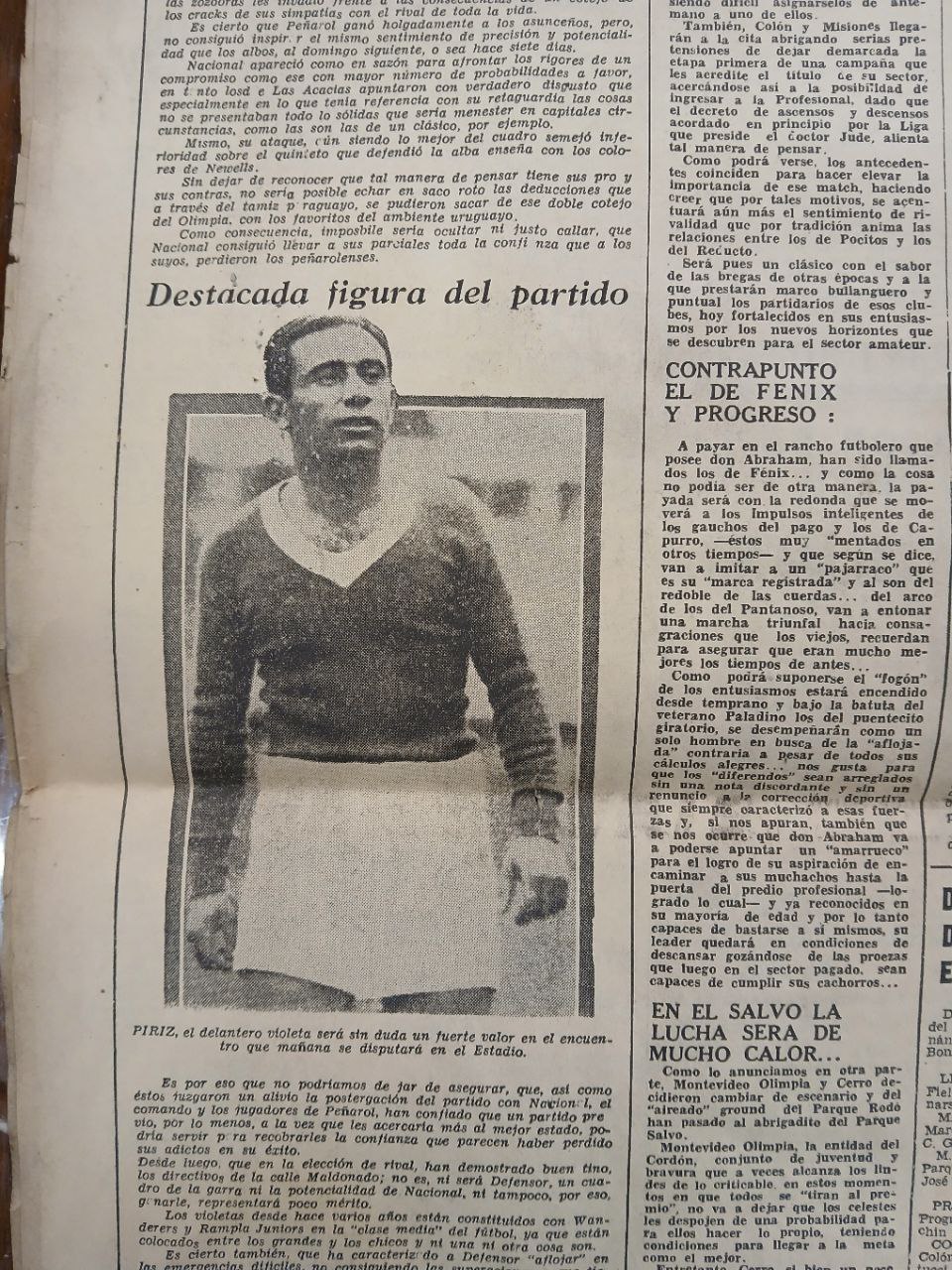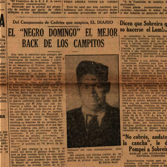 Transcripción de fragmentos de texto: Con toda la emoción que siempre me produce contarle a uno de los mios (nostalgías de barrios tristes y cantinas aspamentosas, verdaderos templos de su Magestad el Truco), encano hoy la pluma pa cantarle con toda la voz del suburbio a Eduardo Olivera “El Negro Domingo”, el mejor back del campeonato de EL DIARIO. Se lo trajo “El Colombes” (¡¡Vos sos buenos lo dio Barboza!!) bien escondidito abajo el poncho. Y la primera vez que lo vi le toco moverse contra una línea de football que hace más mímica que todos los Patos Cabreros juntos. Y sin embargo Olivera te arrancó la ovación de los cuatro costados del potrero. [...] Con su parecido con el Negro de oro de Nacional la hinchada le ha fajado “Domingos”. [...] Es que Olivera viene de Villa Dolores donde hay obligación de ser guapo los tiempos en que pasar el puente de la calle Buxareo había que llevar el bufoso o la faca en la mano. Y de allí es Olivera. Cuando aprendió a mover las guinda escucho el relato de las hazañas del negro Santurio y se largó pa lo scampitos, dispuesto a demostrar que mover bien el zapallo y ser guapo es una misma cosa cuando se ha nacido de la Estación Pocitos pa afuera. Y como criollo Olivera se tiene fe en la parada que se juega. La otra tarde lo encané y le pregunté a boca de jarro. - ¿Quién te gusta en el campeonato? - Primero El Colombes y después el que vos quieras. [...] Me palpita que alguna cusifai de la calle General Prim esta noche deje sin diarios al primer canillita que encane. El Pardo Raúl.