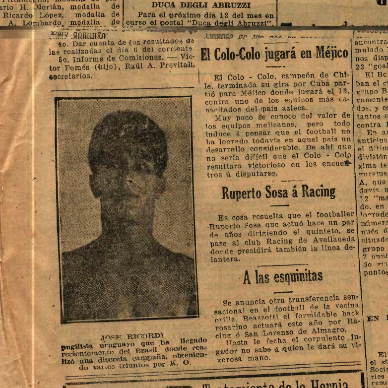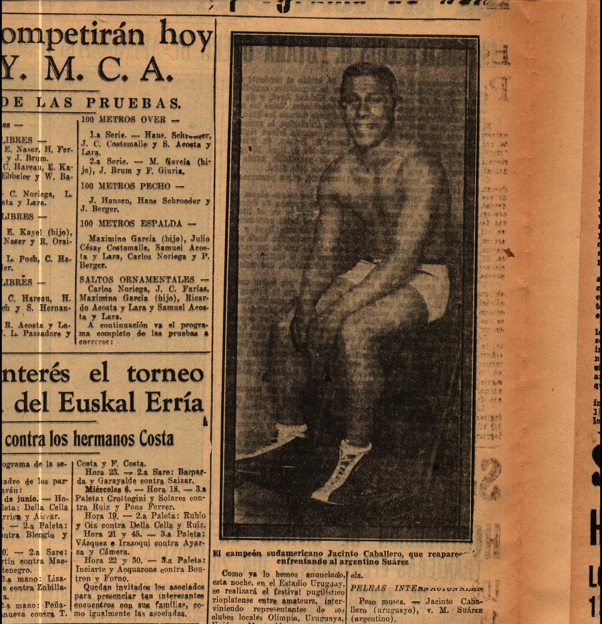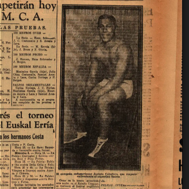 Transcripción de texto: Como ya lo hemos anunciado, esta noche, en el Estadio Uruguay, se realizará el festival pugilístico rioplatense entre amateurs, interviniendo representantes de los clubes locales Olimpia, Uruguaya, Unión y Montevideo, y del Almagro Boxing Club de la vecina orilla, huéspedes nuestros desde la mañana de ayer. [...] PELEAS INTERNACIONALES. Peso mosca. - Jacinto Caballero (uruguayo), v. M. Suárez (argentino). [...]