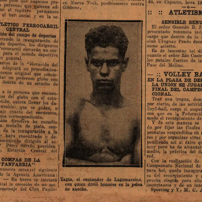 Pie de imagen: Nuestro compatriota, el pugilista Alfredo Buxareo Pastoriza, que anoche se impuso por knock-out al boxeador argentino Francisco Scarfó, match con el que se iniciaron los espectáculos boxísticos de verano en el Estadio del Sporting Club Uruguay.