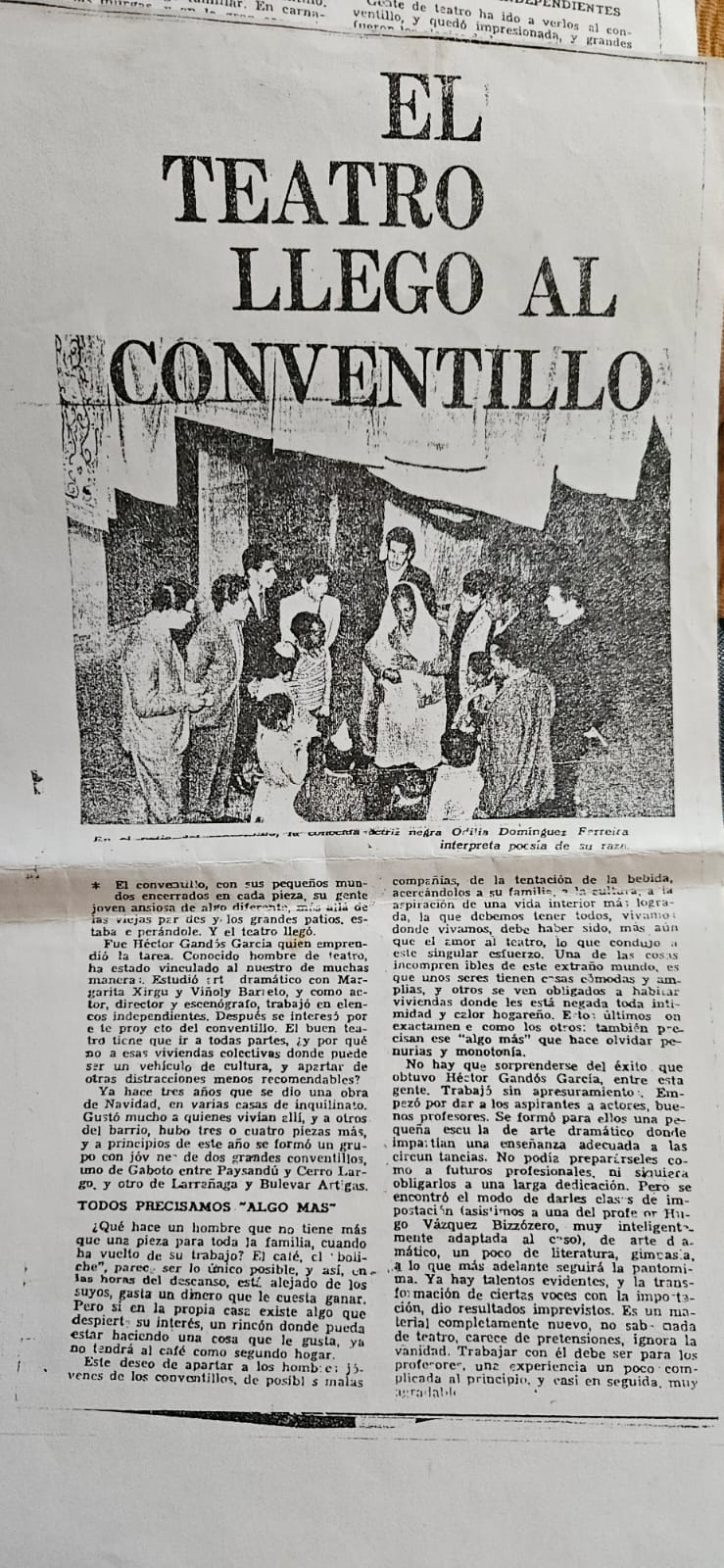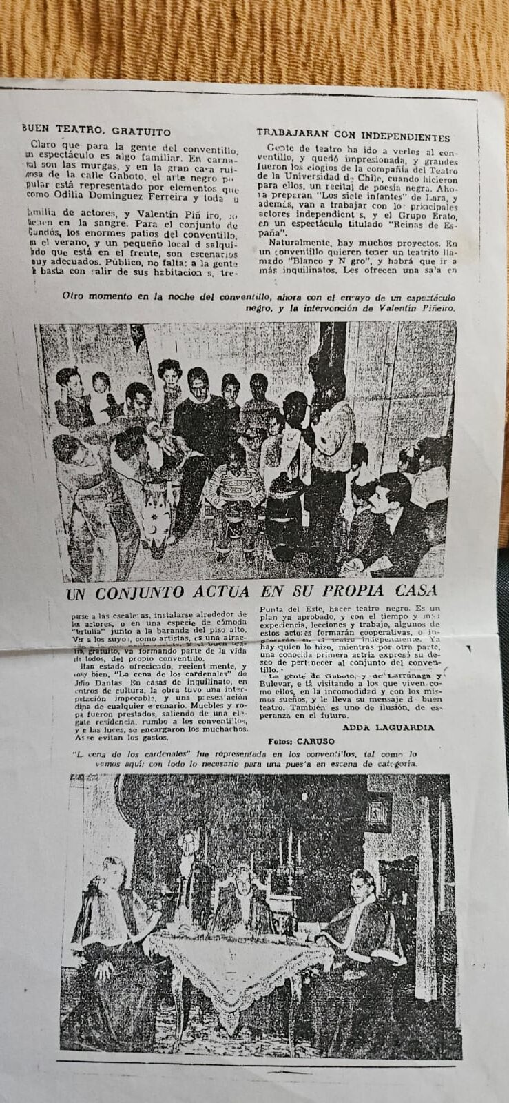 Nota sobre teatro realizado en el Conventillo de Gaboto Realizada por Adda Laguardia Fotos de: Caruso Pie de foto: 1- Ensayo de un espectáculo negro y la intervención de Valentín Piñeiro. 2- “La cena de los cardenales” representada en los conventillos. Observaciones: Imagen aportada por Sra. Silvia Da Rosa (habitante del Conventillo de Gaboto). Sin datos de la fuente ni fecha. Dato aportado por Silvia: En la imagen de “La cena de los cardenales” el señor de la izquierda se apellida Porras y fue dirigente de A.D.E.O.M. por muchos años.